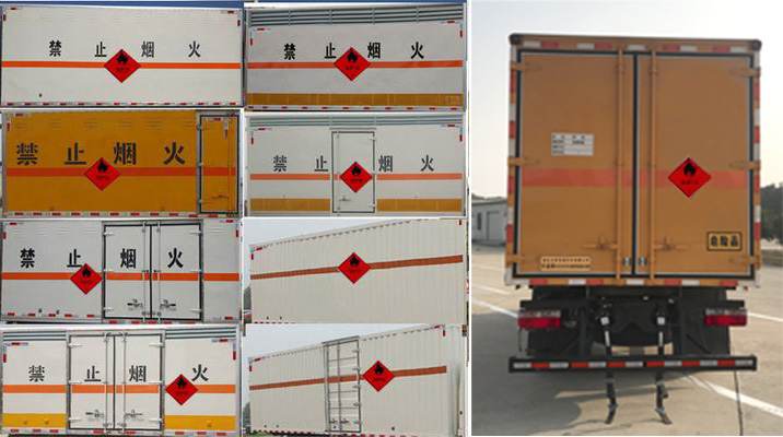 隨底盤選裝駕駛室;該車為危險品運輸車;廂體頂部密封,不可開啟,廂體兩側選裝不同形式側開門及開門位置或不帶側門,廂體側面板選裝開百葉窗,選裝瓦楞板結構.該車運輸具有獨立容器包裝的易燃氣體:液化石油氣,壓縮天然氣,乙炔,乙烷,丙烷,丁烷,異丁烷,丁烯,甲烷,丙烯,環丁烷,丙二烯,甲乙醚,打火機或打火機加油器(裝有易燃氣體),氫,運送危險品類項號為2.1;運輸具有獨立容器(瓶)包裝的非易燃無毒氣體:液化氣體(非易燃,充有氮,二氧化碳或空氣),壓縮氧(氮,空氣,氦,氬,氖),二氧化碳,類項號2.2。側防護材料為Q235,連接方式:焊接連接,后防護截面尺寸(mm):φ115×6,離地高度420mm;選裝無液壓尾板時,后防護材料為Q235,連接方式:焊接連接,后防護截面尺寸(mm):120×50,離地高度420mm,液壓尾板收起狀態的水平長度為280mm,尾板重量為450kg;該車僅使用排氣管前置、前輪為盤式制動器、裝配子午線輪胎的底盤,轉向輪安裝輪胎爆胎應急防護裝置,安裝導靜電帶;該車裝有ABS,ABS型號/廠家:ABS型號:ABS/ASR-24V-4S/4M,廠家:襄陽東風隆誠機械有限責任公司;該車安裝具有衛星定位功能的行駛記錄儀,該車裝配有限速裝置,限速80km/h。發動機型號對應油耗申報值(L/100km):CY4SK261/20.1,CY4SK361/20.4,NV30-C6D/20.3,YCY30165-60/21.3,YCS04190-68/20.3,D25TCIF1/20.3,D30TCIF1/20.2,D40TCIF1/20.3。 |