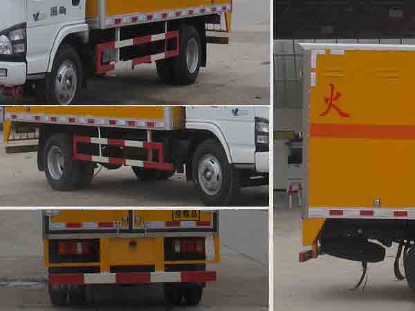 運輸品名:炸藥,雷管,類項號: 1.1D,1.1B。廂體頂部封閉不可開啟,側(cè),后防護裝置材料材質(zhì)為Q235A碳鋼,側(cè)防護與箱體底部螺栓連接,后防護裝置與車架采用焊接連接,后防護截面尺寸(mm):100×50,離地高度為430mm。安裝底盤的前置排氣管結(jié)構(gòu),安裝前輪盤式制動器,安裝子午線輪胎和帶ABS的底盤。安裝帶有衛(wèi)星定位功能的行駛記錄儀。ABS系統(tǒng)生產(chǎn)廠家/型號: 浙江亞太機電股份有限公司/APG3550500A4。 |