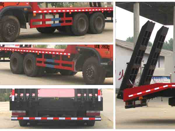 東風本部后雙橋平板運輸車用于裝載運輸工合機械、挖機、鏟車、收割等工合機械運輸,車后部帶后爬梯,帶支腿(液壓或手動),底板為5mm花紋鋼板,方鋼承載筋,貨臺承載面尺寸長5580mm, 寬2500mm,承載面可選裝手動或液壓水平支出.平板離地高度:1050mm。爬梯長度1800-2000mm,傾角30-45度.