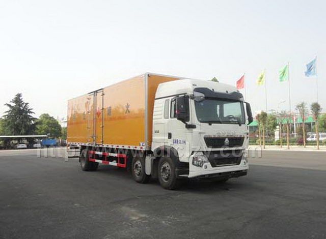 重汽豪沃前四后四國五防爆車\民爆車\炸藥運輸車廂體外飾冷軋鋼板,內飾防靜電鋁板,底板鋪防靜電膠板,側壁設防雨通風窗口,帶捆綁固定拉環,煙霧感應器,防盜報警開關,靜電帶,滅火器2只,車廂黃色,有危險標志,貼有反光標識。