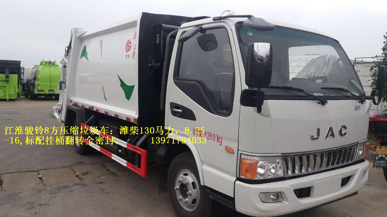 江淮駿鈴8方壓縮式垃圾車采用江淮公司國五環衛車專用底盤:3815mm軸距,車輛保證為正常江淮公司本部商品車狀態,配備濰柴發動機130馬力,按公告尺寸制作,五檔變速箱,8.25R16或7.50R16輪胎,其他按江淮公司標配。