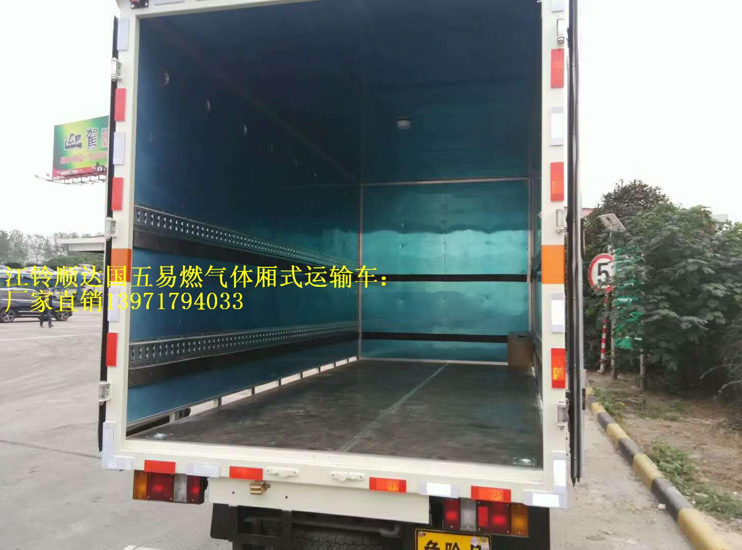 江鈴順達易燃氣體廂式運輸車運輸具有獨立容器(瓶)包裝的易燃氣體:液化石油氣,原油氣,壓縮天然氣,乙炔,甲烷,乙烷,丙烷,丁烷,丙烯,丁烯,二甲醚,打火機或打火機加油器(裝有易燃氣體),壓縮氫,類項號:2.1;運輸具有獨立容器(瓶)包裝的非易燃無毒氣體:液化氣體(非易燃,充有氮,二氧化碳或空氣),壓縮氧(氮,空氣,氦,氬,氖),二氧化碳,類項號2.2;該車為危險品貨物運輸車;廂體選裝瓦楞板結構,廂體側面選裝開門型式及位置或不帶側開門,選裝百葉窗,廂體顏色可變化,選裝液壓升降尾板(收起狀態水平長度為290mm);僅采用前輪盤式制動器,前置排氣管,子午線輪胎,限速裝置的底盤,限速80km/h。廣泛應用于乙醚、煤氣、石油液化企業,是易燃氣體氣瓶及非易燃氣體氣瓶的專用運輸車輛。