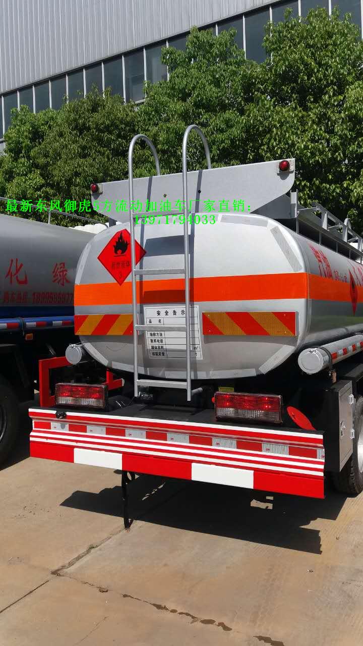 東風御虎國五5方流動加油車客戶選裝配置:優質鋁合金球閥(閥門) ;可分倉(附加一套歐標罐口及海底閥) ;泵進/泵出流量表(合肥流量表/重慶流量表),罐體內部襯塑或罐體內部防腐油漆,升降走道板(保護罐口).選裝加油機倉內或外裝大梁。