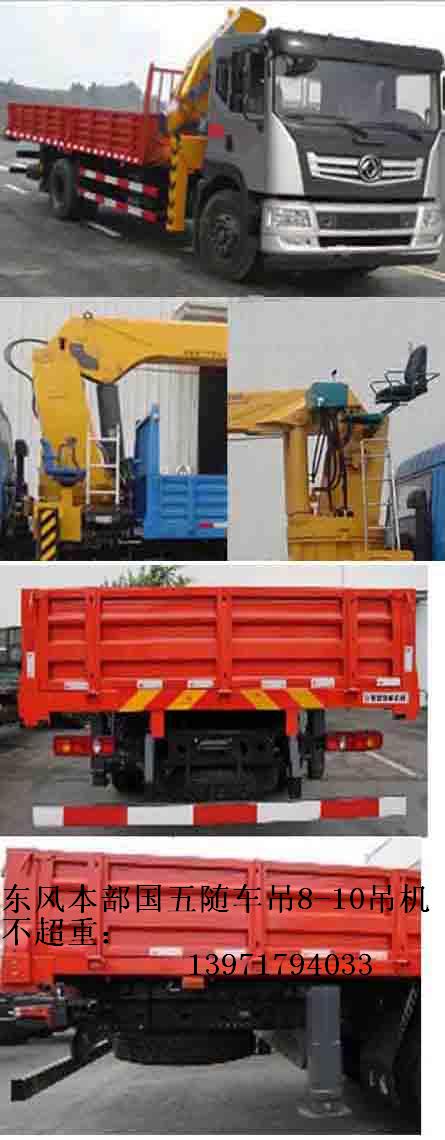 東風本部單橋國五隨車起重運輸車僅選用底盤4700mm,5100mm軸距,選裝箱板結構,選裝上/中座椅操作,可選裝直臂式或折臂式吊機,直臂式吊機:型號/吊機質量(kg)/最大起升載荷(kg)/載質量(kg)分別為:(SPS15800,SQ114,QYS-6.3III,SQS-6.3III,URV630,nicoleV630)/2102/4500/3225(3人)/3290(2人);2.(SPS20000,SQ200,QYS-8,SQS-8III,URV800,nicoleV800)/3300/5500/4225(3人)/4290(2人);折臂式吊機的分別為:1.(SQ6.3Z,QYS-6.3Z)/2300/4500/3225(3人)/3290(2人);2.(SQ8Z, QYS-8Z)/3500/5500/4225(3人)/4290(2人);側防護:材質Q235,螺栓連接.后下防護:材質Q235,焊接連接,斷面尺寸120×60mm,離地高度520mm;安裝具有衛星定位功能的行駛記錄儀;ABS型號為3631010-C2000,生產廠家為東科克諾爾商用車制動系統(十堰)有限公司。