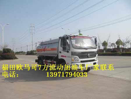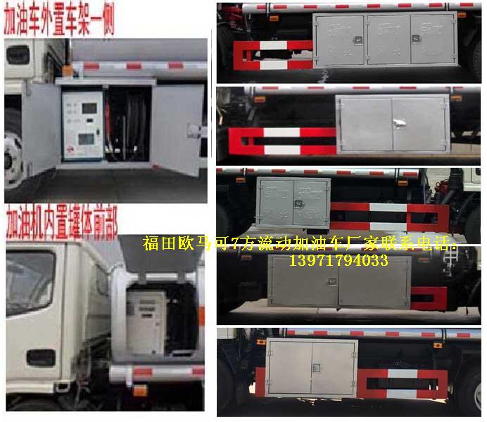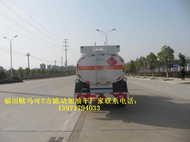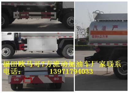 福田歐馬可7方國五流動加油車罐體有效容積:6立方米(公告容積),實際容積7方(嚴格按尺寸制作),介質(zhì):汽油,柴油,類項號:3,密度:700千克/立方米,罐體外形尺寸(長×寬×高)(mm):1,加油機內(nèi)裝于罐體前部時:4200(含加油機倉800)×1960×1320,2,加油機外裝在車架一側(cè)時:4200x1760x1170;.隨底盤選裝駕駛室,排氣管前置,安裝具有衛(wèi)星定位功能的行駛記錄儀,安裝前輪盤式制動器,僅采用底盤子午線輪胎以及限速裝置,限速80km/h。