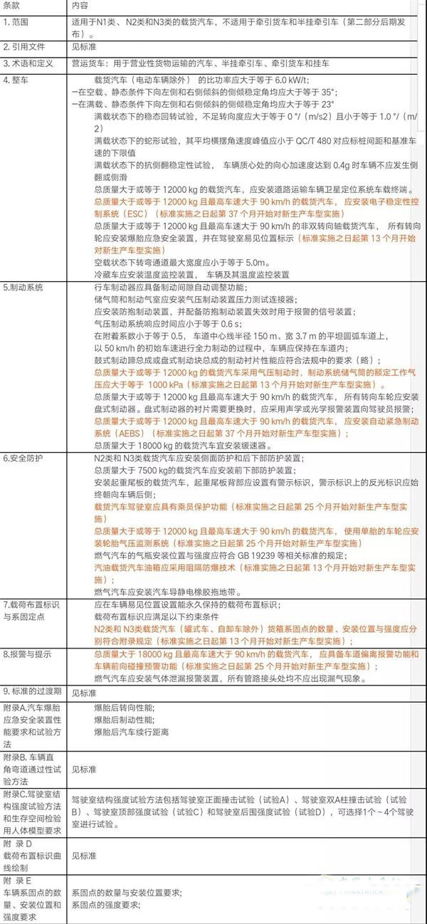 以下為《營運貨車安全技術條件第1部分:載貨汽車》,橙色部分為過渡條款。
