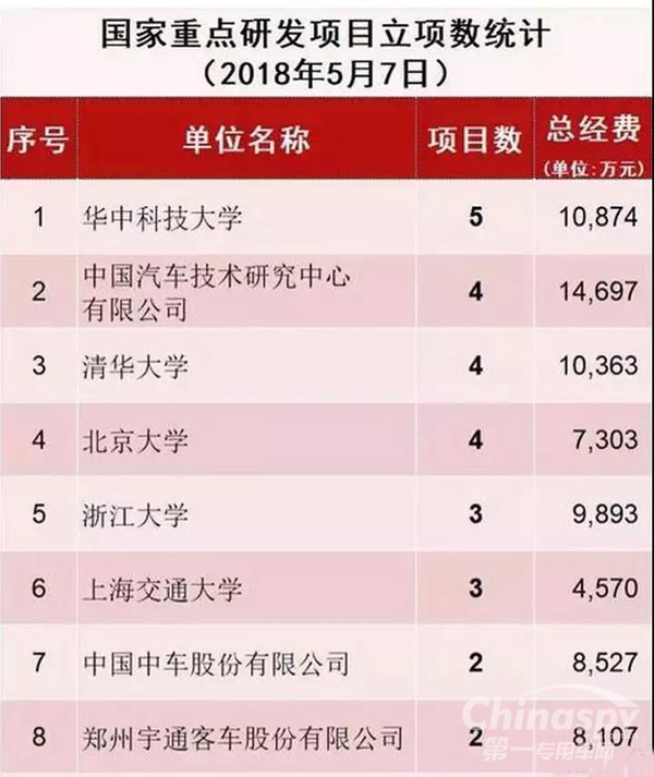 本次公布的擬立項項目總數共128個,總經費超過31億元。其中,51個項目由高校牽頭,占比接近40%,其余項目由科研單位、企業等牽頭。 值得一提的是,在“新能源汽車”重點專項中,共有25項擬立項項目,總金額為8.2億元。其中,鄭州宇通客車股份有限公司牽頭承擔的有2項,分別為《燃料電池公交車電—電深度混合動力系統平臺》(5282萬元)、《高性價比商用車混合動力系統開發與整車集成》(2825萬元),總金額達到了8107萬元。同時,鄭州宇通集團有限公司有1項,項目名稱為《高安全長壽命客車動力電池系統關鍵技術研究》,金額為4805萬元。此外,鄭州宇通重工有限公司也有1項,項目名稱為《N2/N3類純電動商用車動力平臺關鍵技術研究》,金額為2193萬元。這意味著宇通集團總的擬立項數達到了4項之多,占比近1/6,立項數與中國汽車技術研究中心有限公司相同,并遙遙領先于其他汽車企業,總經費也高達1.51億元,占比18.4%。