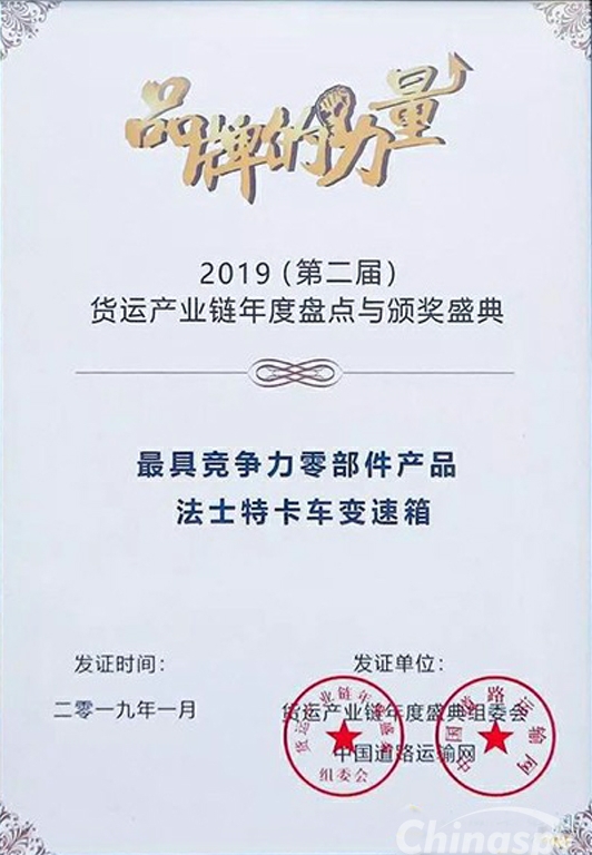 昨日,“品牌的力量”2019貨運產業鏈年度盤點與頒獎盛典在京順利召開。法士特變速器榮獲“最具競爭力零部件產品”獎。