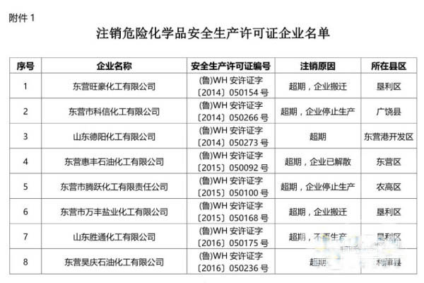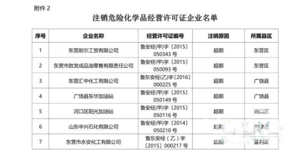 今日從山東省東營市應急管理局官方網站了解到,東營旺豪化工有限公司等15家危險化學品企業許可證被注銷。具體注銷企業名單如下: