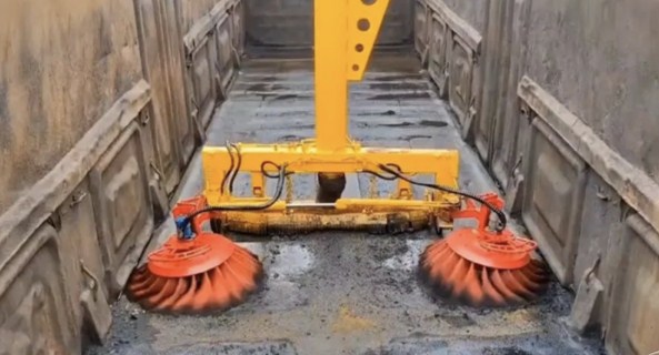 目前,國內港口火車貨廂余料清掃主要是通過打開車廂側門,人工進廂清掃收集轉運,勞動強度大,效率低,易揚塵,清掃不干凈,而且還存在攀爬車廂登高清掃作業安全風險。為了實現火車貨廂余料機械化清掃,配合港口開發了火車貨廂清掃車產品,該產品能夠實現火車貨廂卸料后底部殘留的煤渣、礦粉等余料的清掃和收集,操作簡單,效率高,無揚塵。該產品不僅有火車貨廂清掃功能,還具有洗掃車的功能,能夠對火車卸料平臺、港口道路進行洗掃、灑水、噴霧降塵等作業。